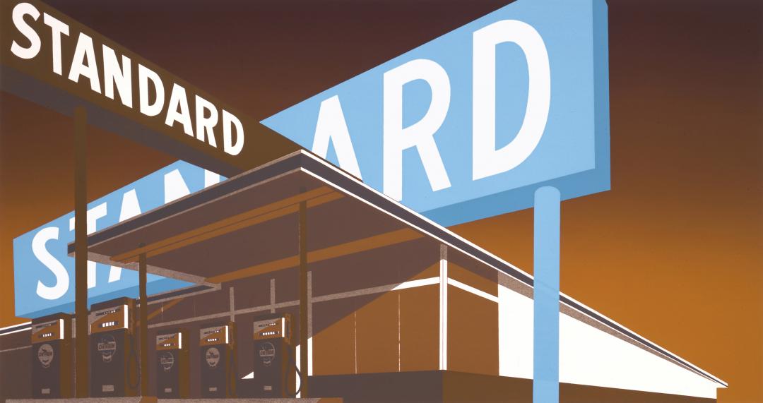 Ruscha is particularly known for his restrained, sober reproductions of the Hollywood sign, stylised gasoline stations and archetypal American landscapes. With motifs taken from locations around California, he became one of Los Angeles’ foremost exponents of Pop art, together with David Hockney, among others. It is not surprising that Ruscha’s nickname in the American art world has been “King of the West Coast”.